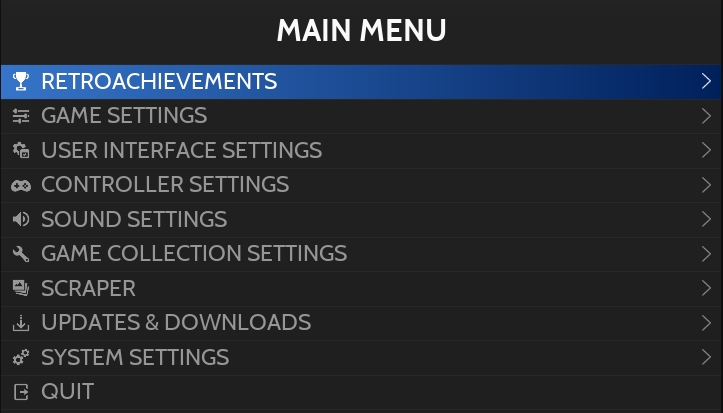 To display your RetroAchievements global status, from the MAIN MENU select RETROACHIEVEMENTS