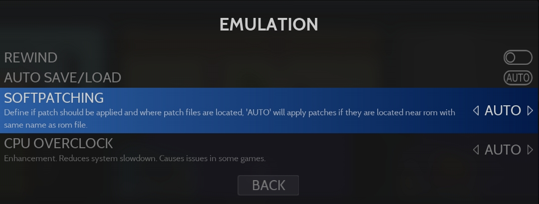 Patches can be applied in 3 different ways. Depending on which method you choose, you'll need to select the corresponding option in the RetroBat menu: