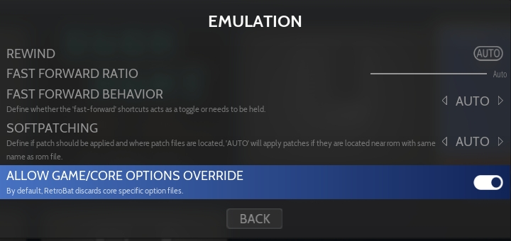 Last, enable the override option in RetroBat MAIN MENU > GAME SETTINGS > RETROARCH OPTIONS > EMULATION