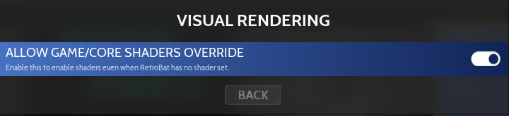 Finally, enable the Shaders override option in RetroBat MAIN MENU > GAME SETTINGS > RETROARCH OPTIONS > VISUAL RENDERING: