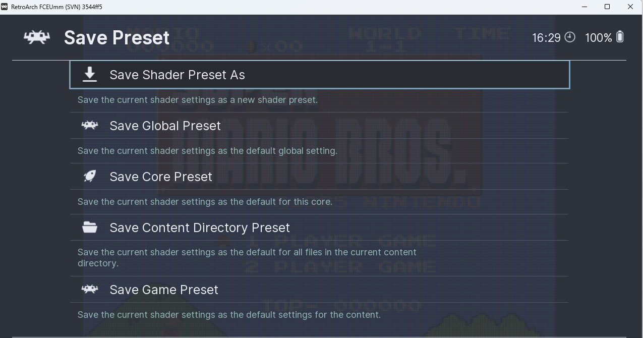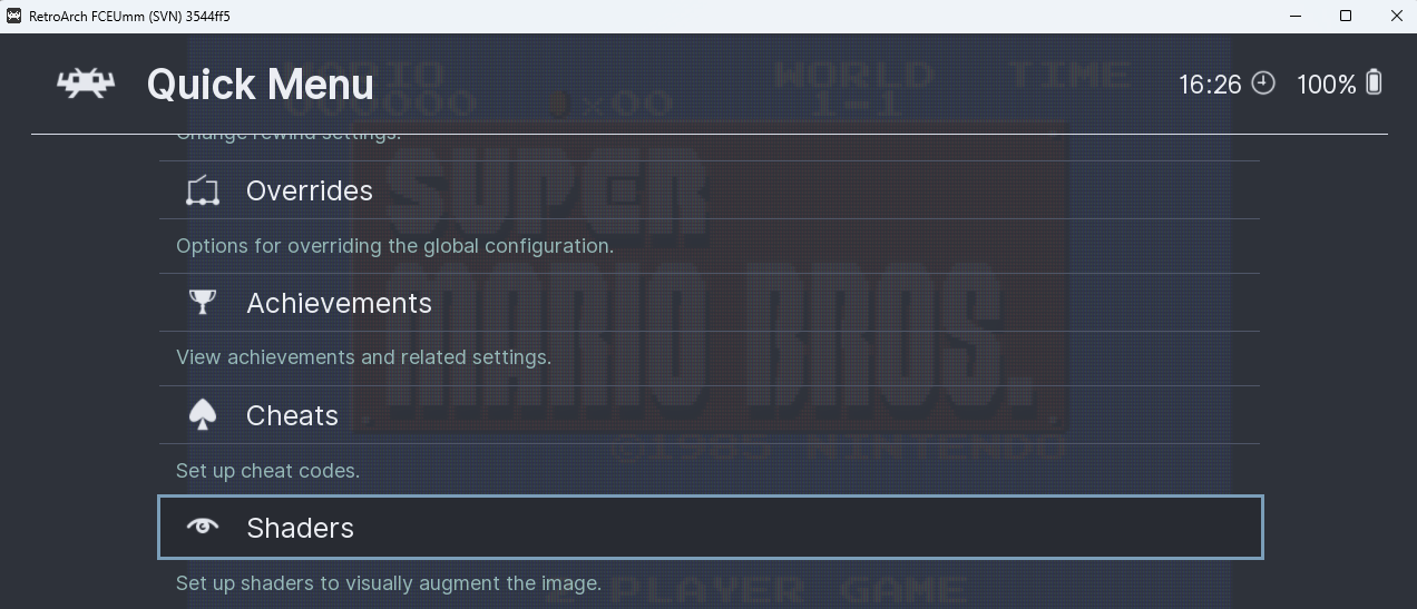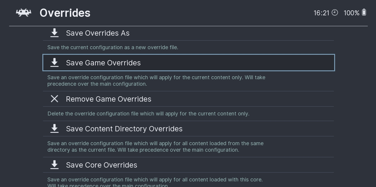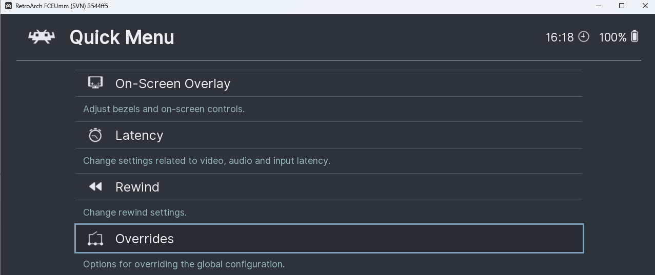 on your controller (F1 on keyboard). Perform all required RetroArch general settings, then open the "Overrides" menu: