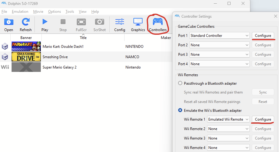 Click on the "Controllers" icon in the taskbar, then select "Configure" (pick the right system depending on the game, this works both for Gamecube and Wii)