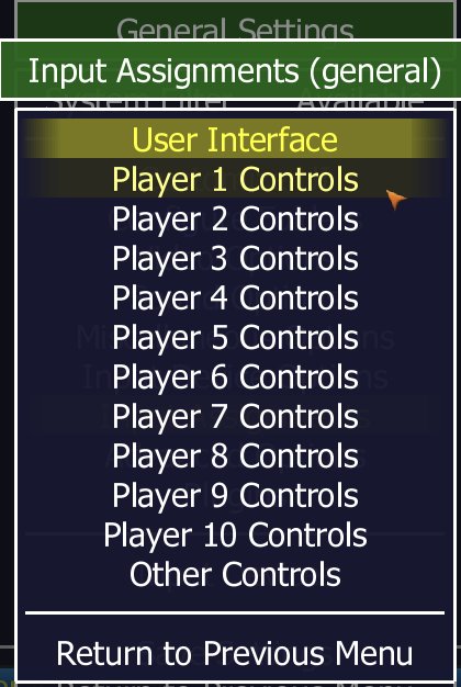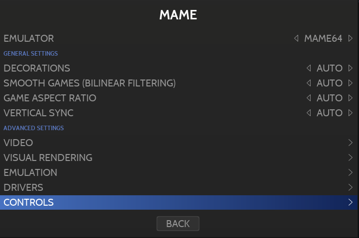 Ensure the MAME64 emulator is set as EMULATOR and navigate to the CONTROLS submenu: