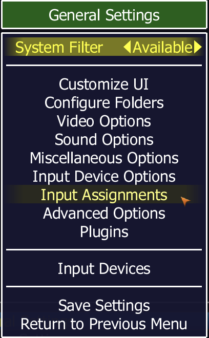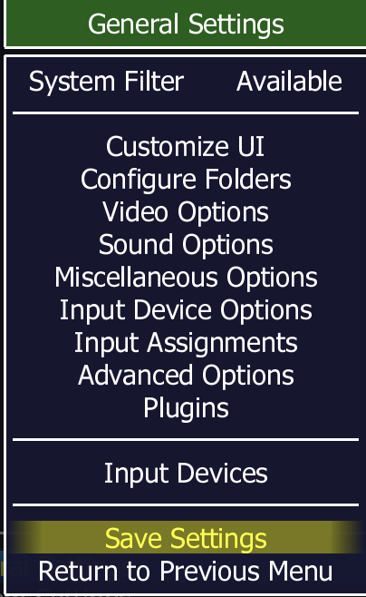 From the MAME Game view, press SELECT to open the View Options menu and select "ADVANCED SYSTEM OPTIONS"