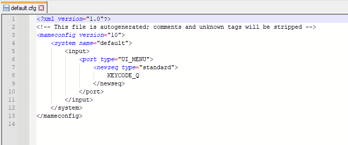 In the example, the keyboard key "Q" has been assigned to the action "UI_MENU" that opens the MAME menu.