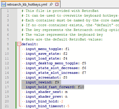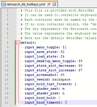 The file retroarch_controller_hotkeys.yml can be used to overwrite controller hotkeys assignment, and the file retroarch_kb_hotkeys.yml to overwrite keyboard hotkeys.