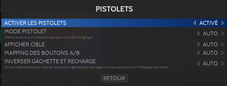 La comptabilité avec les pistolets est une fonctionnalité assez récente dans Retrobat, pour une utilisation correcte sur certains émulateurs (Model2, Model3, Teknoparrot, ...), il sera nécessaire d'effectuer des réglages directement dans les émulateurs.
