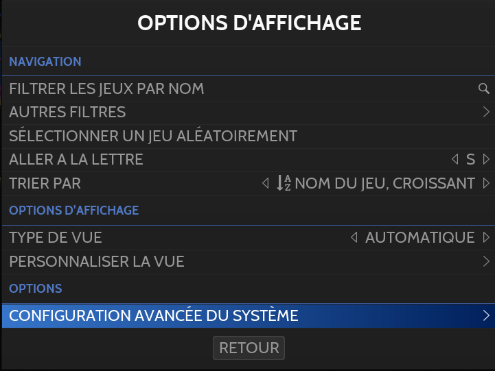 Depuis la Vue Jeux ouvrir les options d'affichage et sélectionner CONFIGURATION AVANCÉE DU SYSTEME