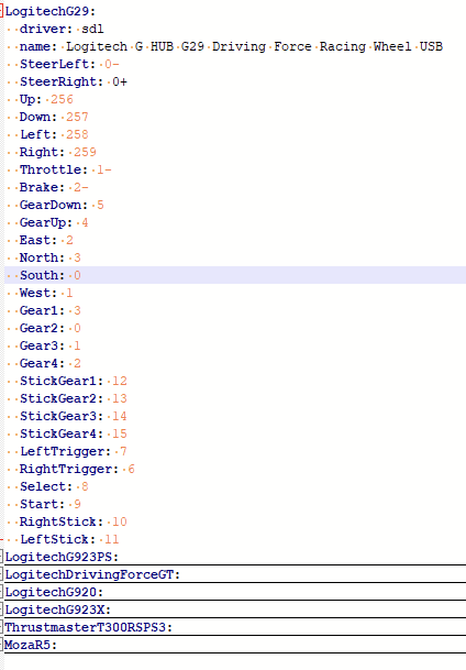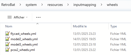 Le mapping du volant pour un volant en particulier peut être réalisé depuis les fichiers de configuration situés dans le dossiersystem\resources\inputmapping\wheels de votre installation RetroBat installation: