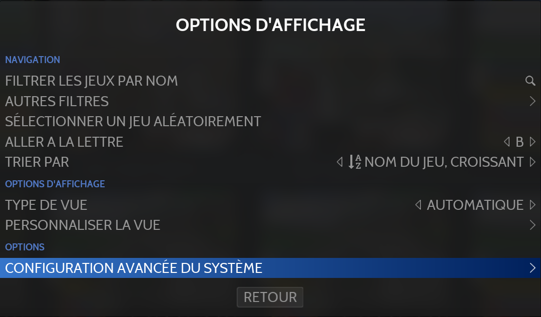 Pour activer le volant pour un système, depuis la Vue Jeux, ouvrez les Options d'Affichage et sélectionnez CONFIGURATION AVANCÉE DU SYSTÈME.