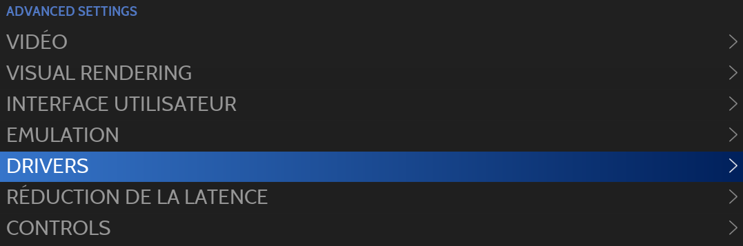 Sélectionner le sous-menu DRIVERS dans la catégorie ADVANCED SETTINGS :