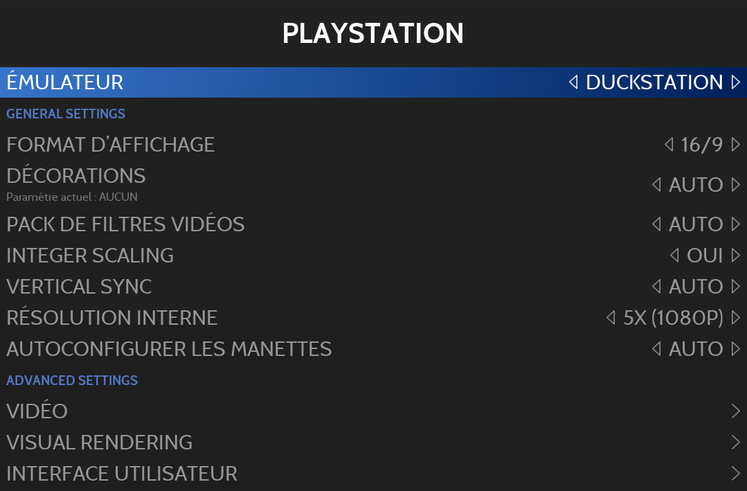 Lors du lancementdu jeu, RetroBat va automatiquement définir la valeur suivante dans le fichier de configuration de Duckstation avant de démarrer le jeu :