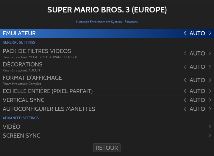 Au niveau du jeu, la valeur "AUTO" correspond à la valeur définie au niveau système/émulateur.