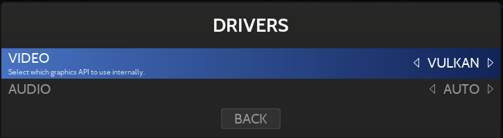 DRIVERS : les options permettant de changer les pilotes vidéos, audios, les pilotes des manettes utilisées par les émulateurs