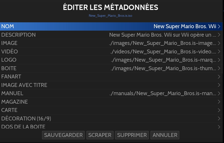 Le menu Options du Jeu permet également de modifier manuellement les métadonnées des jeux: