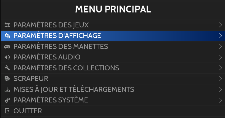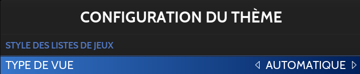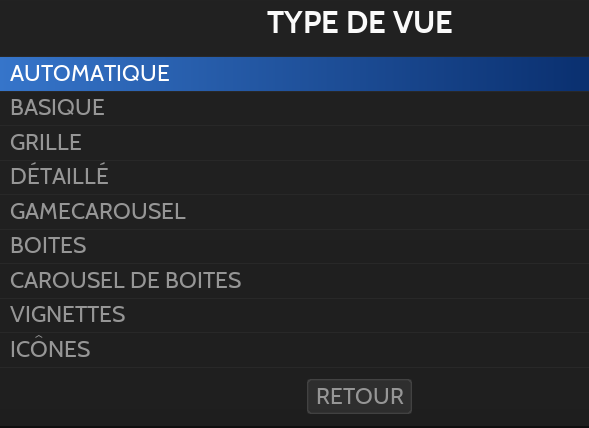 Il existe plusieurs "types" d'affichage pour la liste de jeux, les différentes options sont disponibles depuis les Options d'Affichage (touche SELECT):