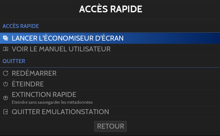 Depuis ce menu il est possible d'afficher le manuel utilisateur, de lancer l'économiseur d'écran ou encore de quitter Retrobat.