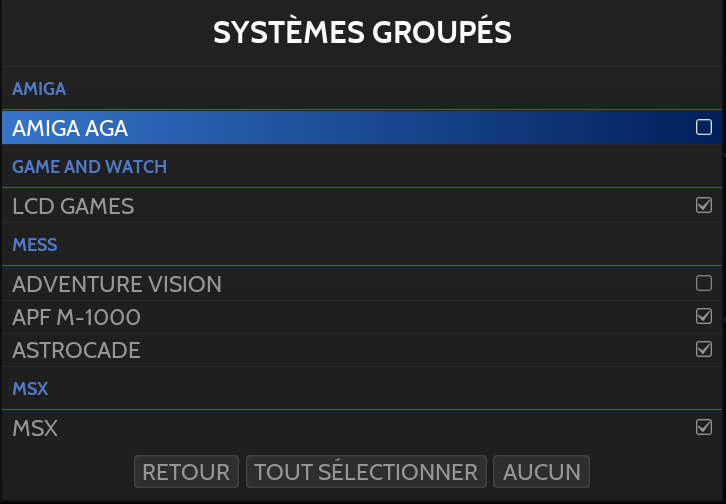 Par défaut, seuls les systèmes pour lesquels des jeux ont été placés dans le dossier \roms apparaissent.
