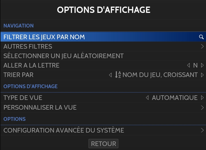 Le menu OPTIONS D'AFFICHAGE est accessible depuis la Vue Jeux en appuyant sur SELECT.