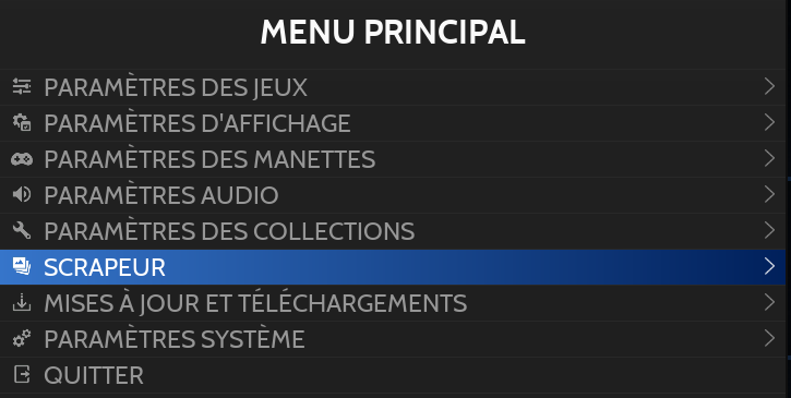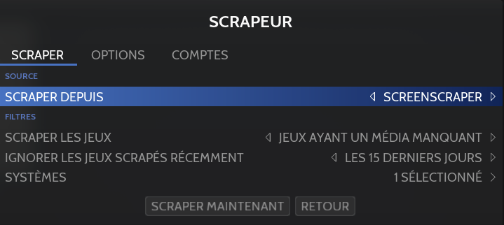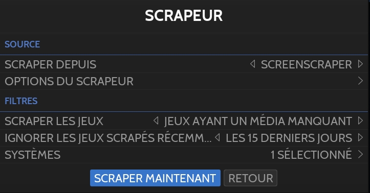 Le "scrape" peut être effectué pour tous les systèmes (global), par système ou par jeu.