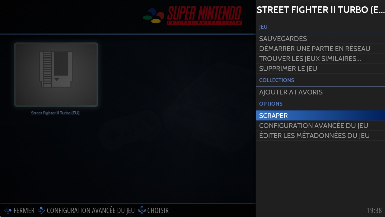Pour scraper un jeu individuellement, sélectionner le jeu et rester appuyé sur afin d'afficher le menu du jeu puis choisir SCRAPER.
