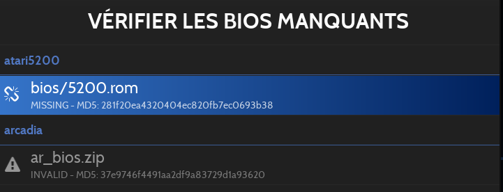 les BIOS dont les hash MD5 ne correspondent pas a ceux prédéfinis par Retrobat apparaissent avec une icône