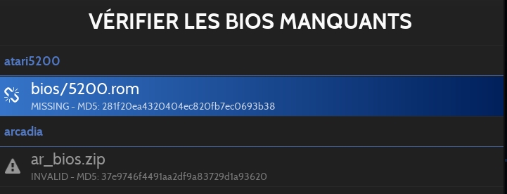 les BIOS dont les hash MD5 ne correspondent pas a ceux prédéfinis par Retrobat apparaissent avec une icône .