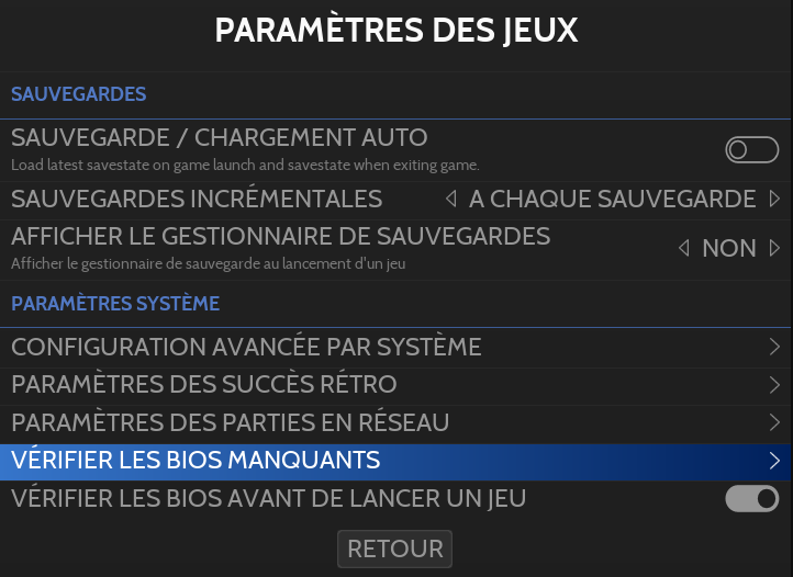 Il est possible de VÉRIFIER LES BIOS MANQUANTS depuis le menu PARAMÈTRES DES JEUX du MENU PRINCIPAL: