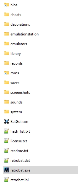 Une fois RetroBat installé, le répertoire contient les dossiers et fichiers suivants :