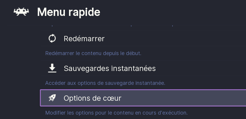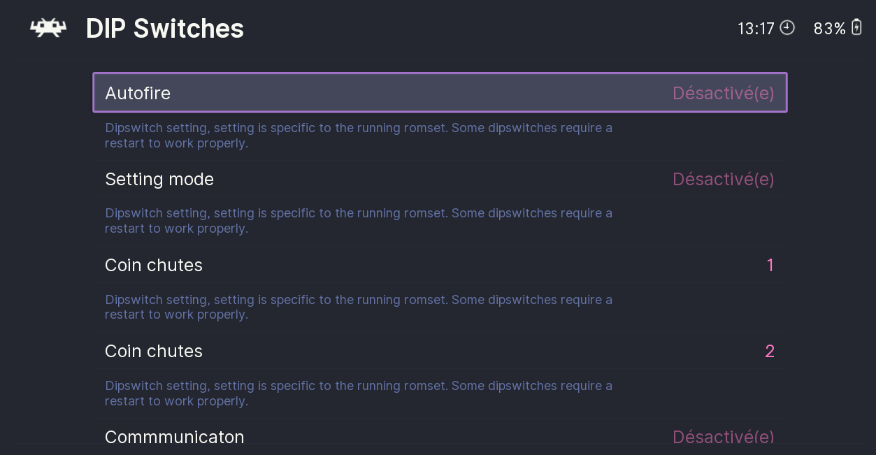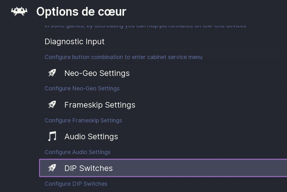 Pour accéder aux "dip switchs", depuis une partie, accéder au menu rapide RetroArch en pressant SELECT + ![]()