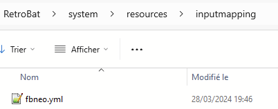 Le fichier contenant les informations pour la configuration des contrôles est disponible dans le dossier \system\resources\inputmappingde votre installation RetroBat, il est nommé fbneo.yml