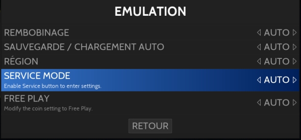 Pour accéder au Service Menu des jeux NAOMI, il est nécessaire dans un premier temps d'activer le SERVICE MODE dans les paramètres avancés du système dans RetroBat (mettre OUI):