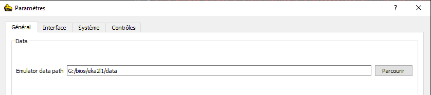 Depuis l'émulateur, cliquez sur le menu "paramètres", et dans l'onglet Général du nouveau menu, renseignez le dossier \bios\eka2l1\data comme chemin pour les dossiers de données :