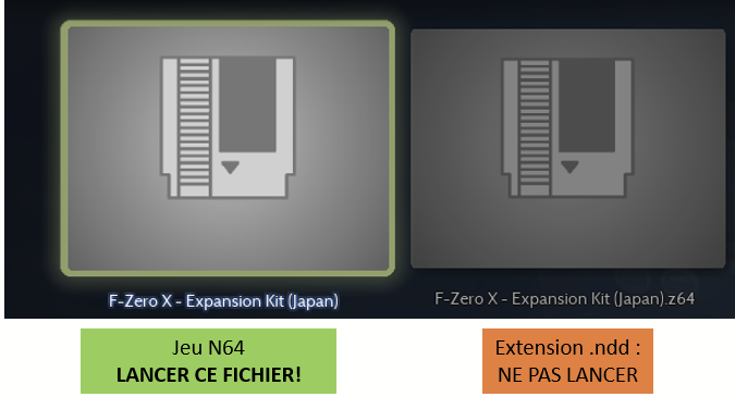 Dans le cas des extensions de jeu, le fichier .n64 représente la ROM du jeu et le fichier .ndd en est l'extension n64DD.