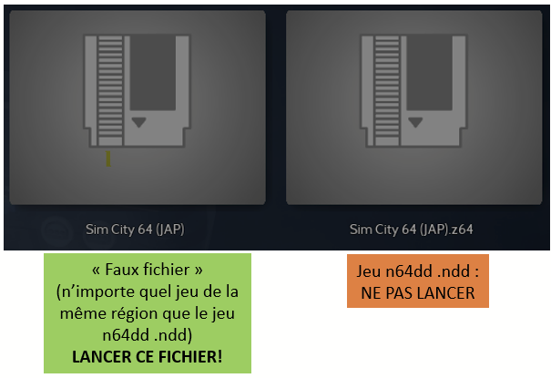 Dans le cas des jeux complets n64DD, le fichier .ndd ne suffit pas pour lancer le jeu, l'émulateur nécessite la présence de 2 fichiers. Il convient donc d'ajouter un fichier .n64 en copiant une autre ROM de jeu n64 (peu importe laquelle car elle ne sera pas réellement utilisée) et en la renommant du même nom que le fichier .ndd (sans l'extension .ndd mais avec l'extension .n64).