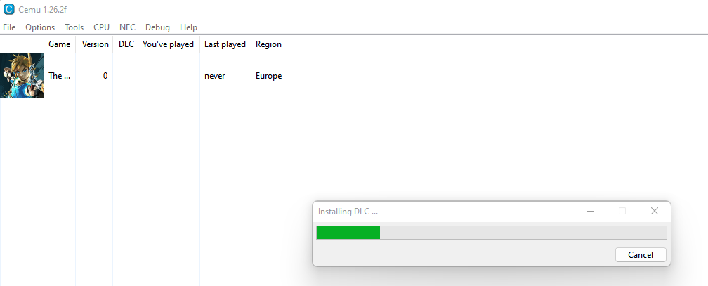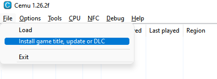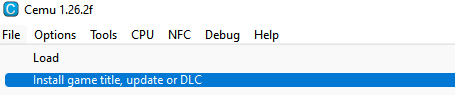 Les mises à jour et DLC de vos jeux doivent être installés directement dans l'émulateur Cemu en utilisant l'option "install title, update or DLC" du menu. Le format des mises à jour et des DLC est identique au format des jeux, ils se présentent sous la forme de dossiers au format "Bootloader".