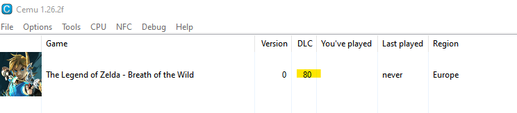 Cemu affiche la version ou le niveau du DLC dans les colonnes "Version" et "DLC".