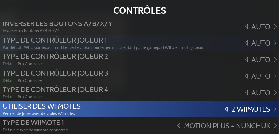 Pour cela, sélectionner l'option "UTILISER DES WIIMOTES" dans les options avancées du système ou du jeu: