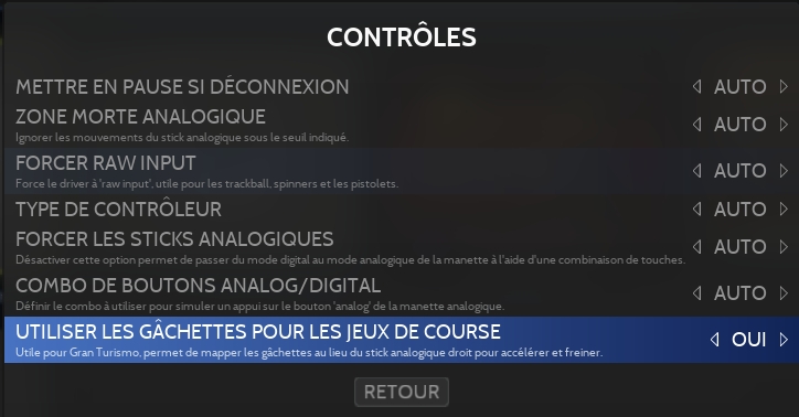 Afin de pouvoir utiliser les gâchettes analogiques pour les jeux de course, il est possible d'utiliser un schéma de contrôles alternatif en activant cette option: