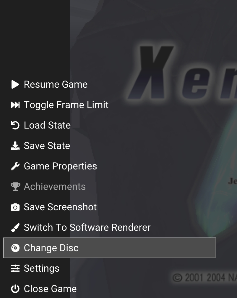 Lorsque le jeu demande de changer de disque, accéder au menu PCSX2 avec la combinaison SELECT + de votre manette, et sélectionner "Change Disc"