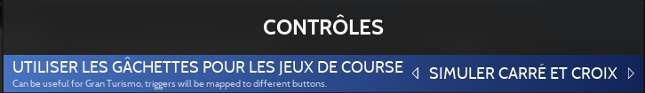 Afin de pouvoir utiliser les gâchettes analogiques pour les jeux de course, il est possible d'utiliser un des schémas de contrôles alternatifs en activant cette option: