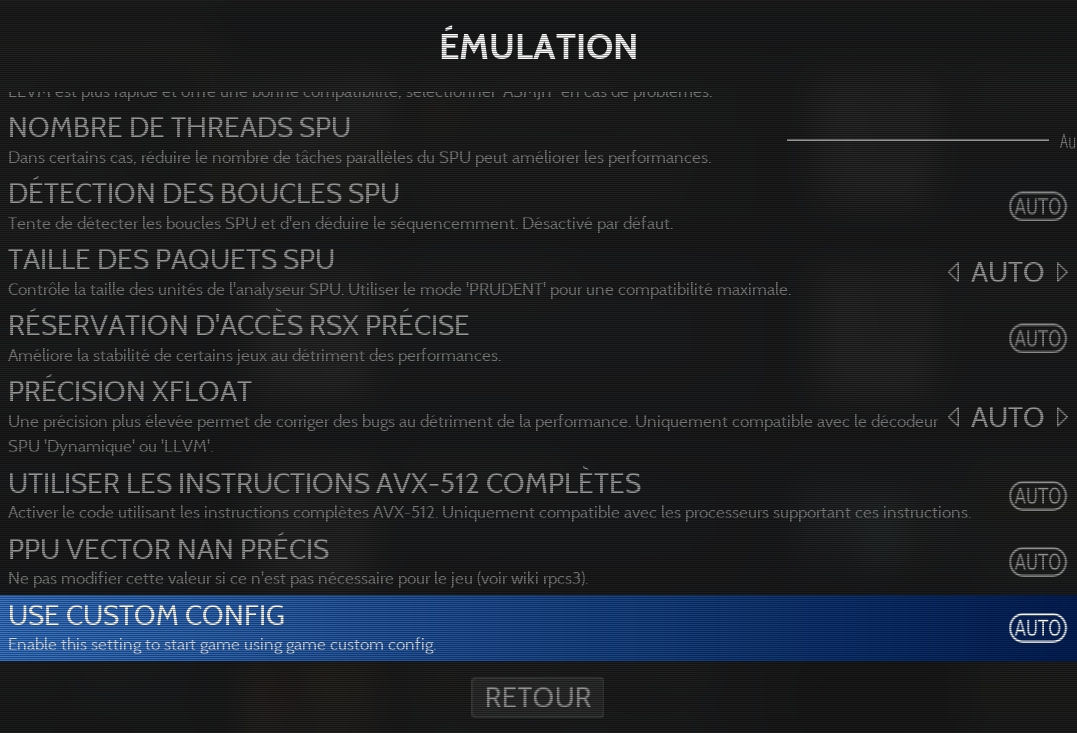 Si vous souhaitez que RetroBat utilise les paramètres par jeu crées depuis RPCS3, il faudra alors activer l'option "USE CUSTOM CONFIG" depuis la section émulation des paramètres avancés.