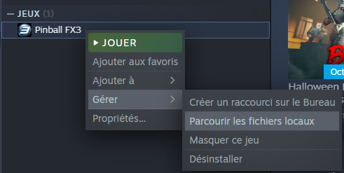 Effectuer un clic droit sur le jeu Pinball FX3, puis sélectionner "Gérer > Parcourir les fichiers locaux". L'explorateur windows s'ouvre dans le dossier d'installation du jeu..