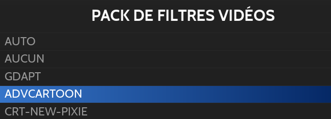 Pour l'exemple, nous chercherons a ajouter le filtre vidéo "advcartoon" à la liste de filtre prédéfinis de Retrobat, ce filtre étant disponible aussi bien en GLSL qu'en SLANG :
