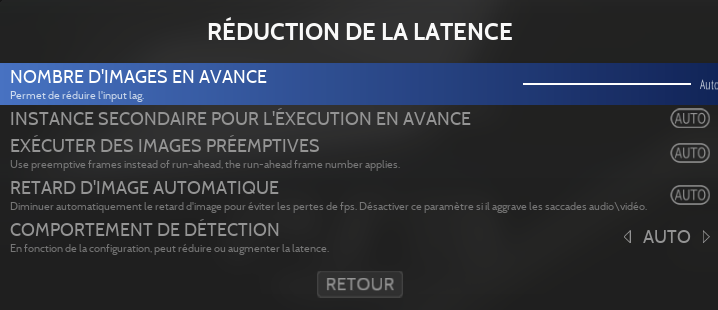 Cette fonction peut être utilisée pour réduire la quantité de latence inhérente à chaque jeu et peut également aider à compenser la latence liée aux écrans. C'est une fonction qui s'applique uniquement aux systèmes Retroarch.