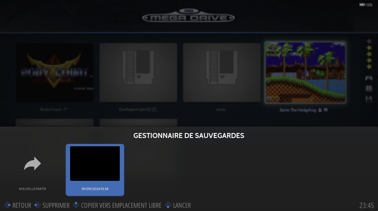 Depuis la liste des jeux de RetroBat, sélectionner le jeu et appuyer sur la touche pour faire apparaître le gestionnaire de sauvegardes: