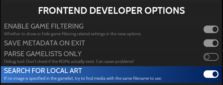 From the SYSTEM SETTINGS, in "frontend developer options", enable "Search for local art"