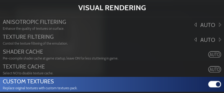 To do so, place the texture packs in the `emulators\vita3k\textures\import` folder of your RetroBat installation and enable the option in ADVANCED SETTINGS > VISUAL RENDERING: