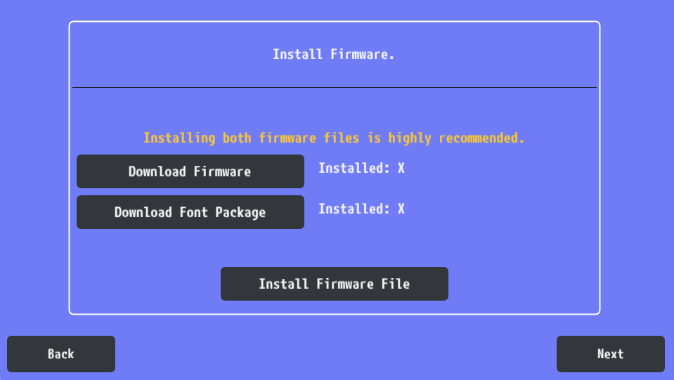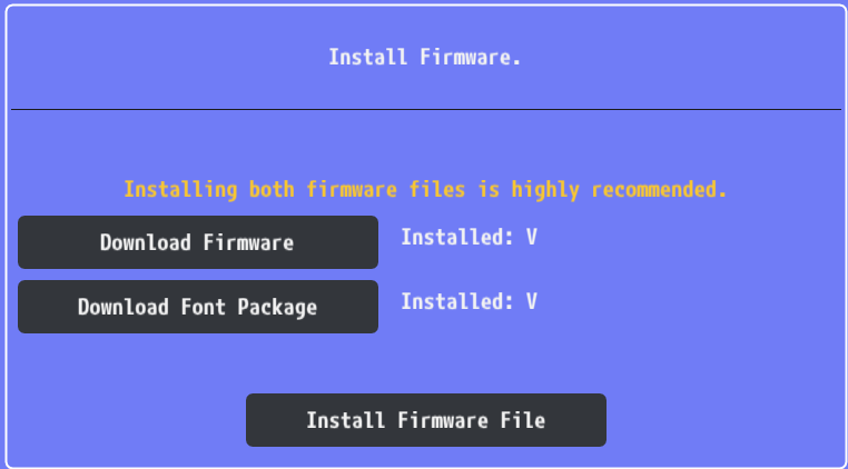 Download both Firmware and Font Package files on the Sony website and install them with the INSTALL FIRMWARE FILE button: