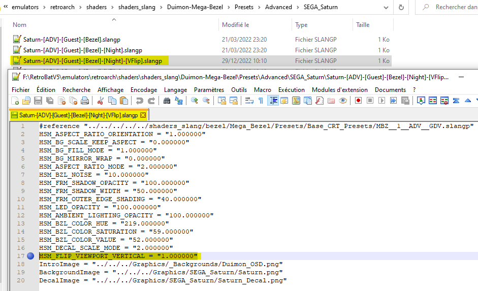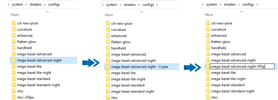 Go to the folder system\shaders\configs and copy one of the existing subfolders (in our example "mega-bezel-advanced-night"), rename the new folder "mega-bezel-advanced-night-VFlip" (this is the name that will appear in the RetroBat menu :